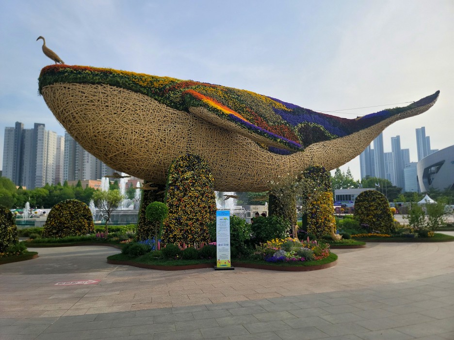 노래하는 분수대에 큰 꽃 고래가 보입니다.